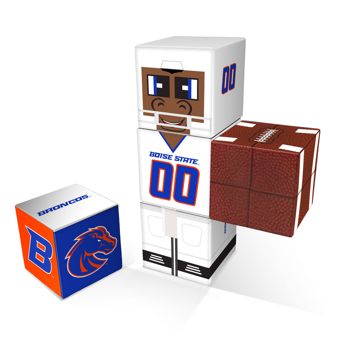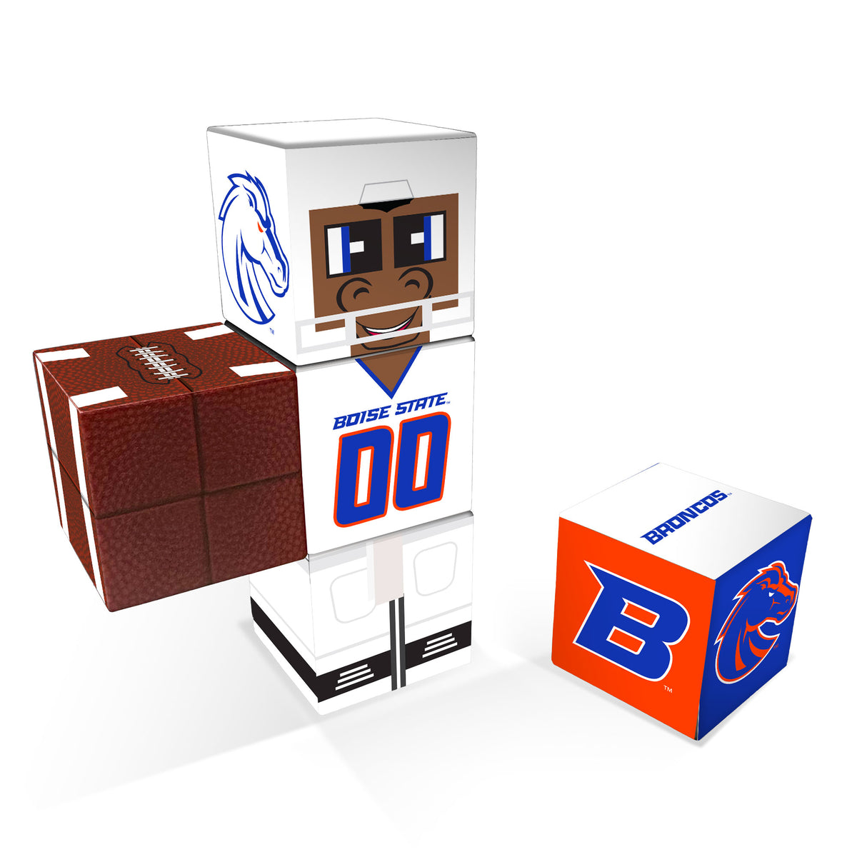 Crafted from 5 magnetic cubes total, this QuBee™ features a 3-cube-tall character figure styled in the classic Boise State away jersey design. The set also includes 2 accessory cubes—one detailed team logo cube and one football cube—perfect for building, posing, and showing off your school spirit.