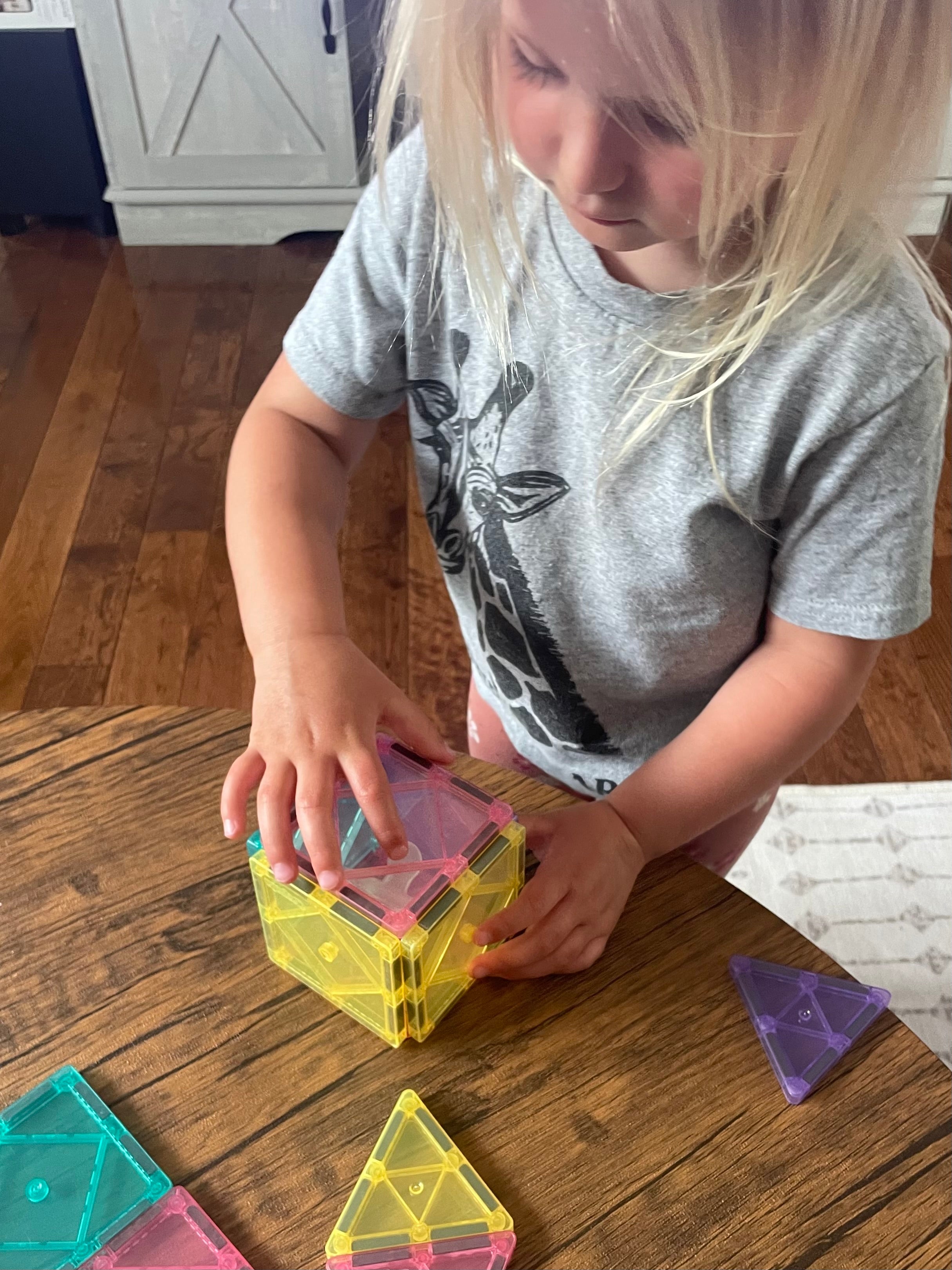 With 10 square tiles and 4 equilateral triangles, kids and families can build calming structures, soothing patterns, and imaginative creations inspired by soft color play. Each tile connects easily and stays sturdy, encouraging open-ended building, storytelling, and hands-on learning with these educational magnetic tiles.