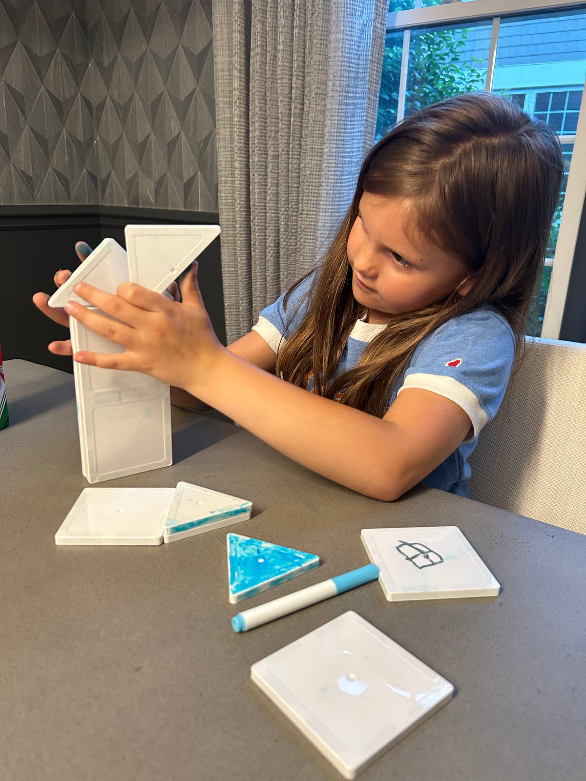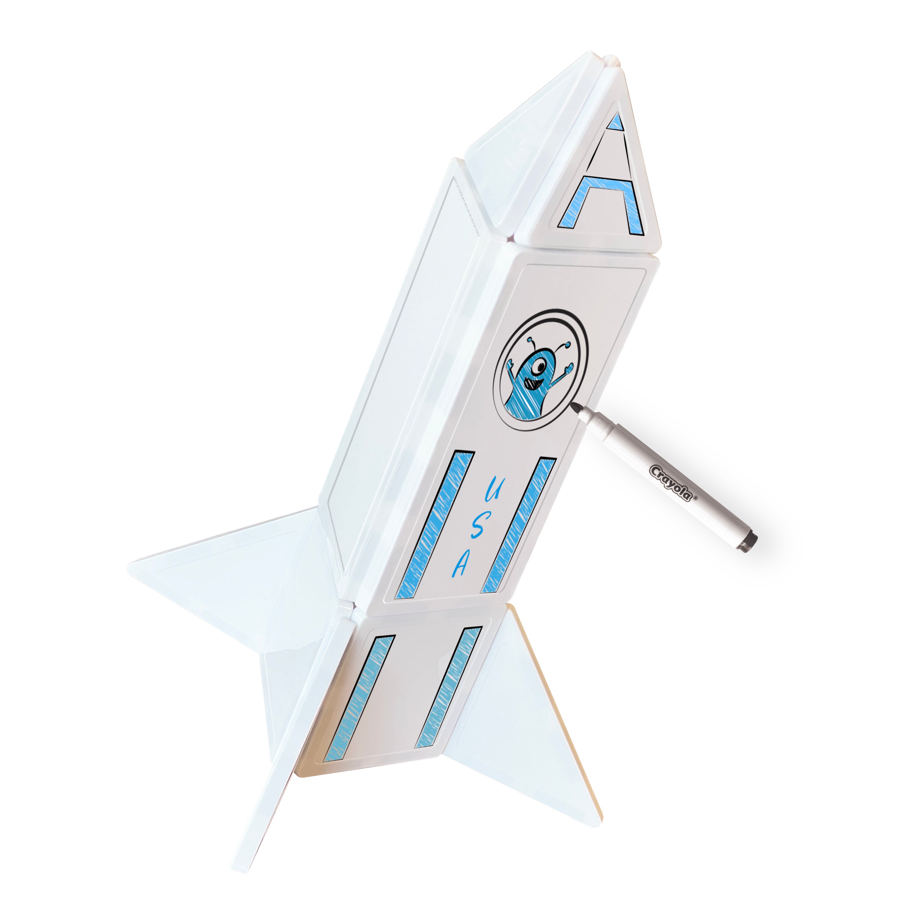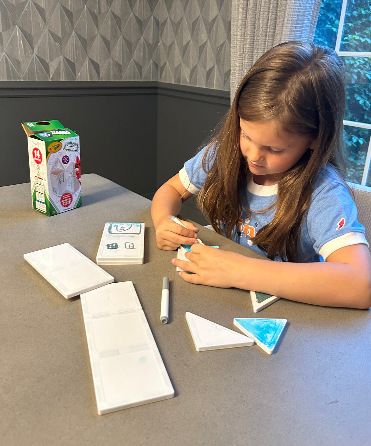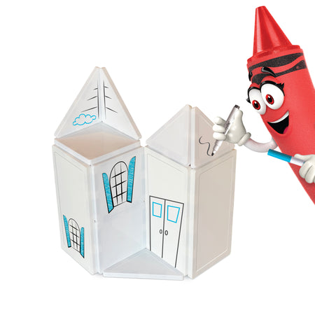 The set includes 3 square tiles, 3 right triangles, 3 equilateral triangles, 3 large rectangles, and 2 Crayola write-on/wipe-off markers. Kids can sketch their own patterns, faces, decorations, and designs—then build dynamic structures and scenes using their creations. When they’re ready for something new, the tiles wipe clean for fresh storytelling and open-ended play, making it a fun educational magnetic toy for hands-on learning.