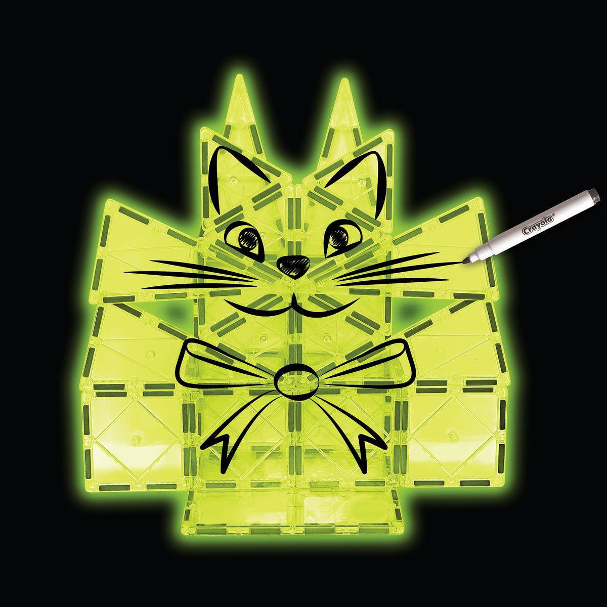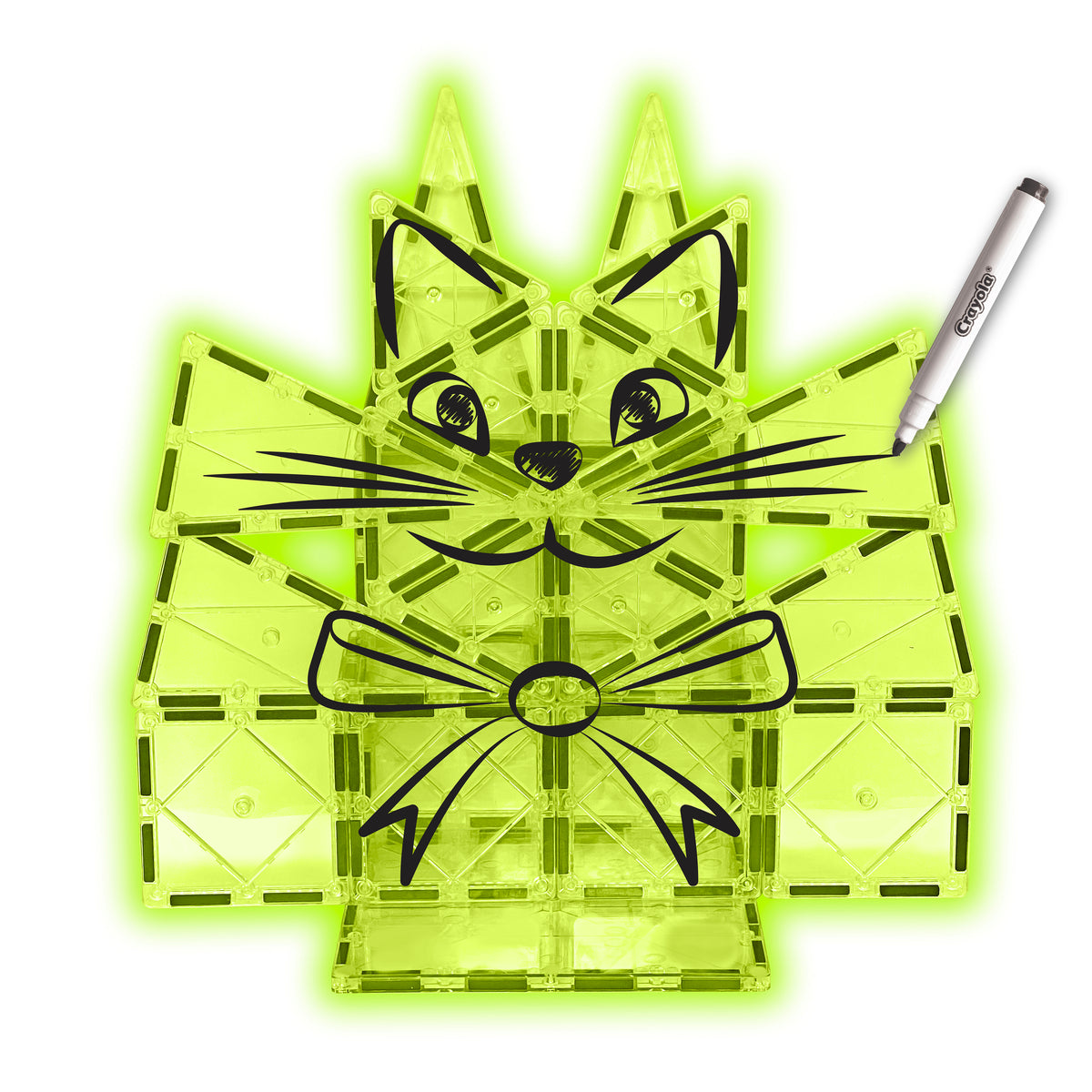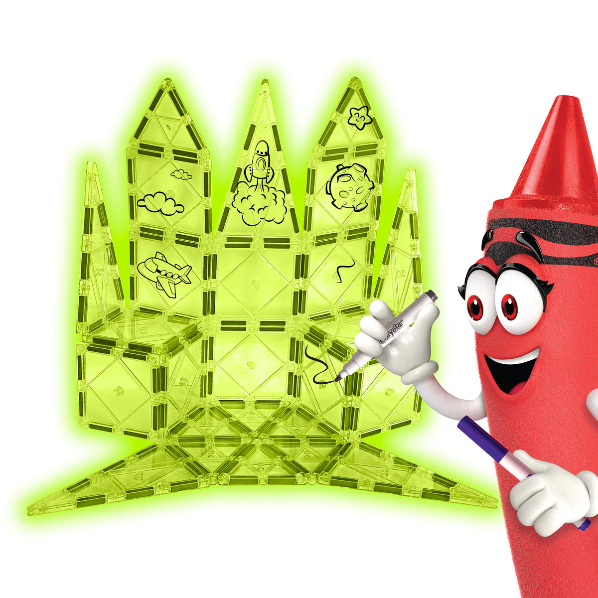 The set includes 12 square tiles, 8 equilateral triangles, 6 isosceles triangles, 1 large square tile, and 2 Crayola write-on/wipe-off markers. Kids can build glowing towers, geometric creations, imaginative characters, and custom artwork— then wipe it away to start fresh whenever inspiration strikes, making this a fun educational magnetic toy for hands-on play.