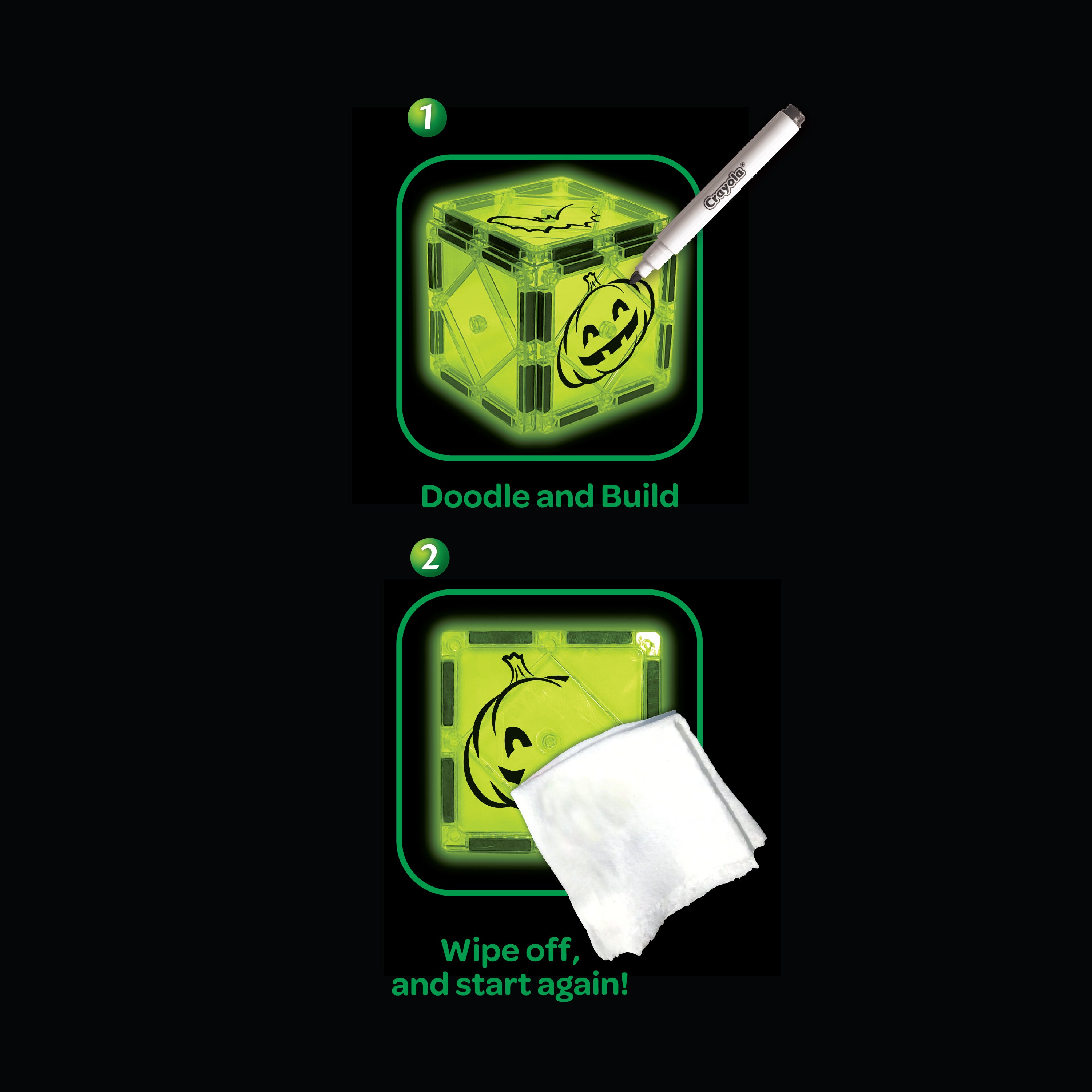 Bring bright ideas to life—day or night—with the Crayola Doodle Glow Tiles 30-Piece magnetic tile building set! Designed for creators ages 3 to 99, this set combines magnetic building fun with glow-enhanced tiles and doodle-friendly surfaces that kids can draw on, wipe clean, and redesign endlessly.