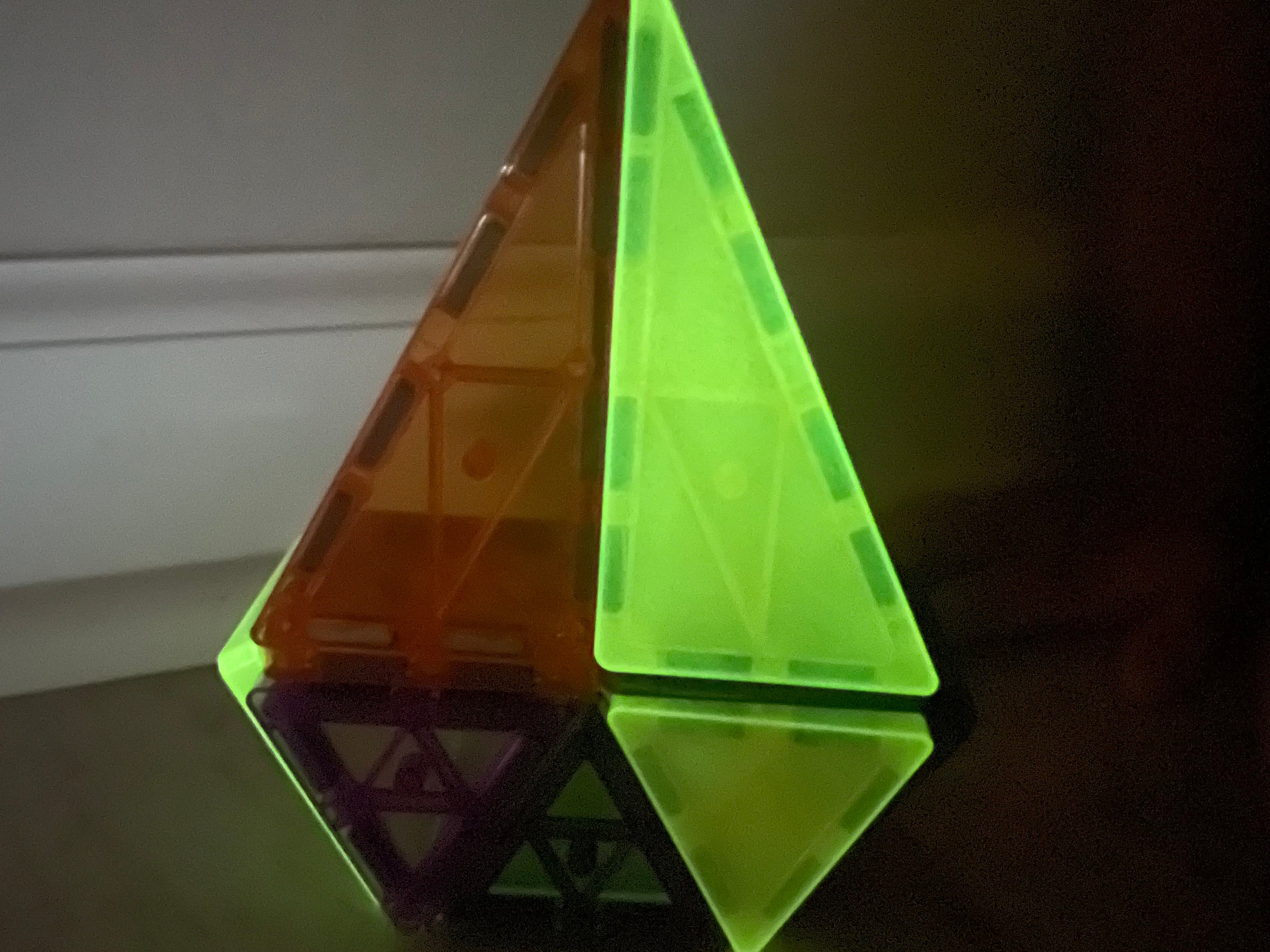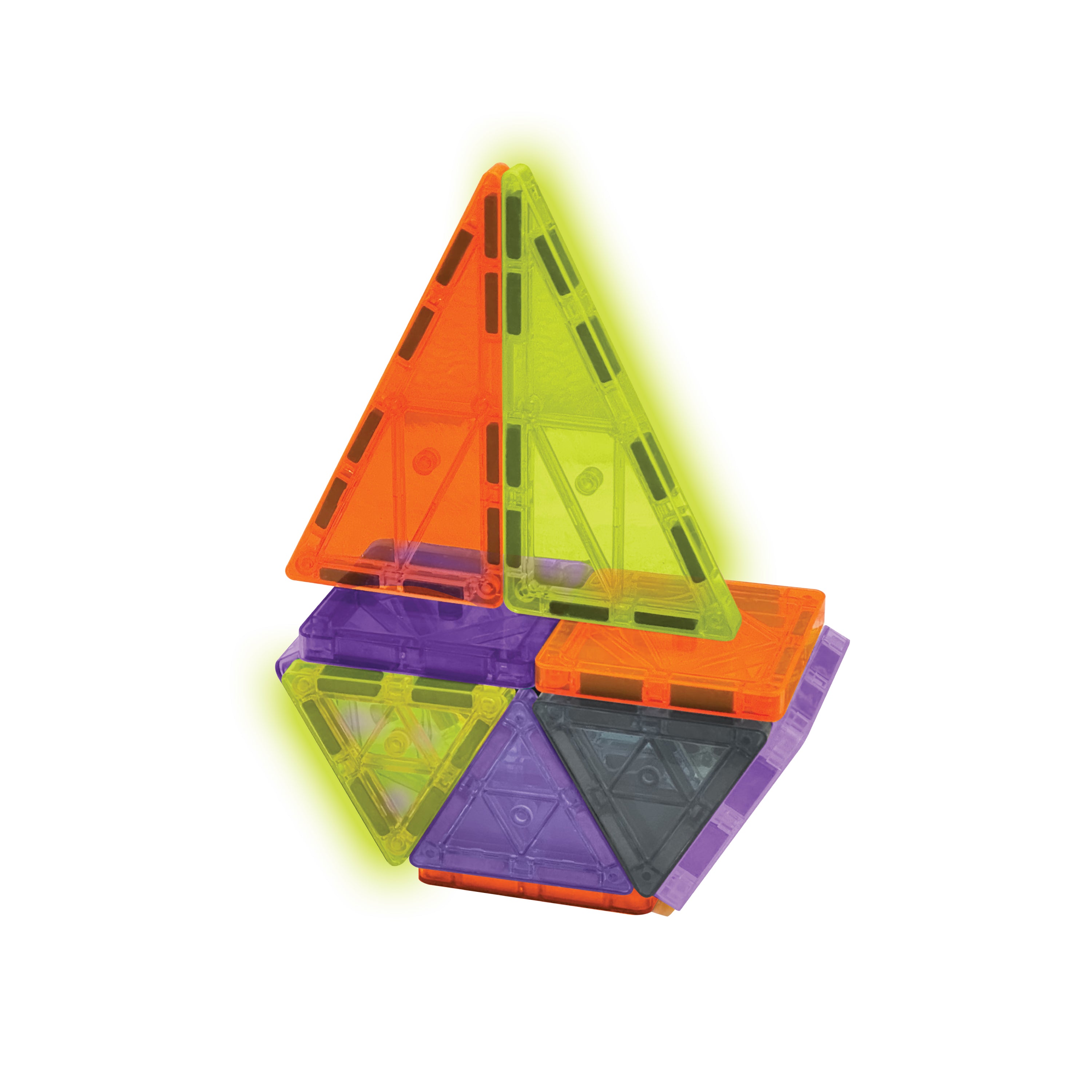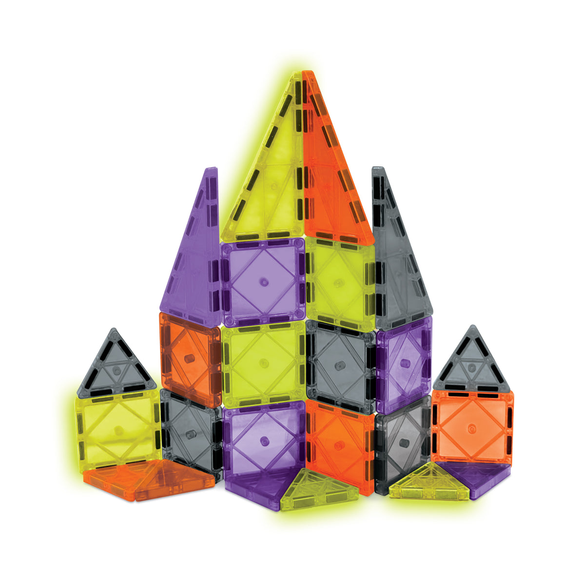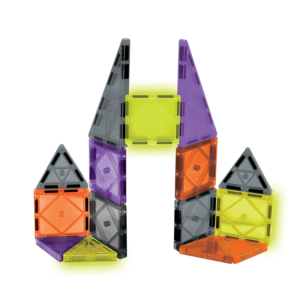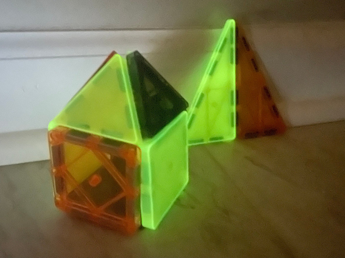 The set includes 12 mini square tiles, 8 mini equilateral triangles, and 4 mini isosceles triangles, each designed to connect easily for open-ended building play. Perfect for nighttime fun, sensory exploration, and seasonal creativity, these tiles shine brilliantly when the lights go out—making it an exciting Halloween gift for kids and a favorite for spooky season building.