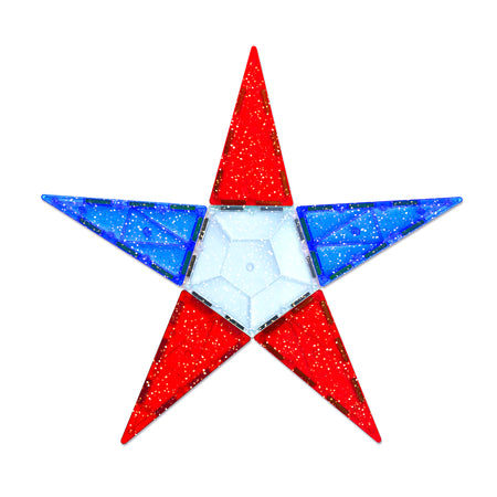 With 8 square tiles, 5 isosceles triangles, and 1 pentagon, kids and families can build dazzling stars, festive structures, patriotic patterns, and imaginative designs that sparkle from every angle. These magnetic tiles connect easily and inspire open-ended building, hands-on learning, and creative exploration—making it a fun holiday gift for kids and classroom activity.