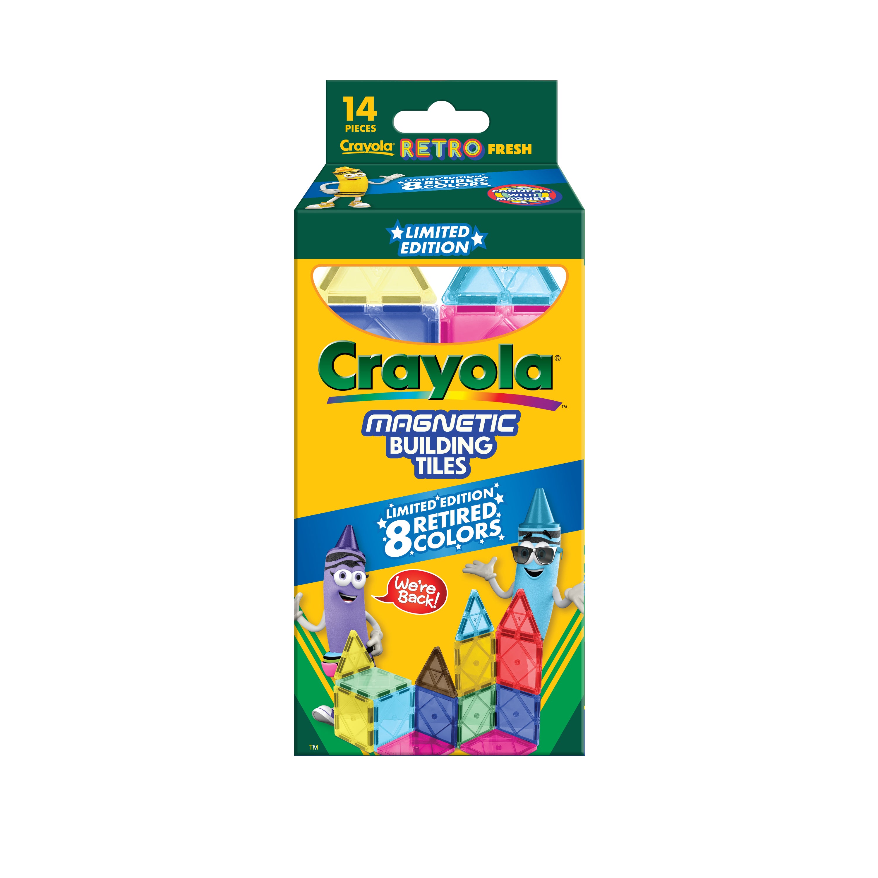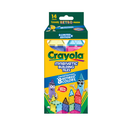 Bring back the classics with the Crayola Retro Colors Magnetic Tiles 14-Piece magnetic tile building set! Designed for creators ages 3 to 99, this nostalgic collection features beloved Crayola retired shades: Raw Umber, Dandelion, Orange Red, Magic Mint, Lemon Yellow, Violet Blue, Blizzard Blue, and Mulberry.