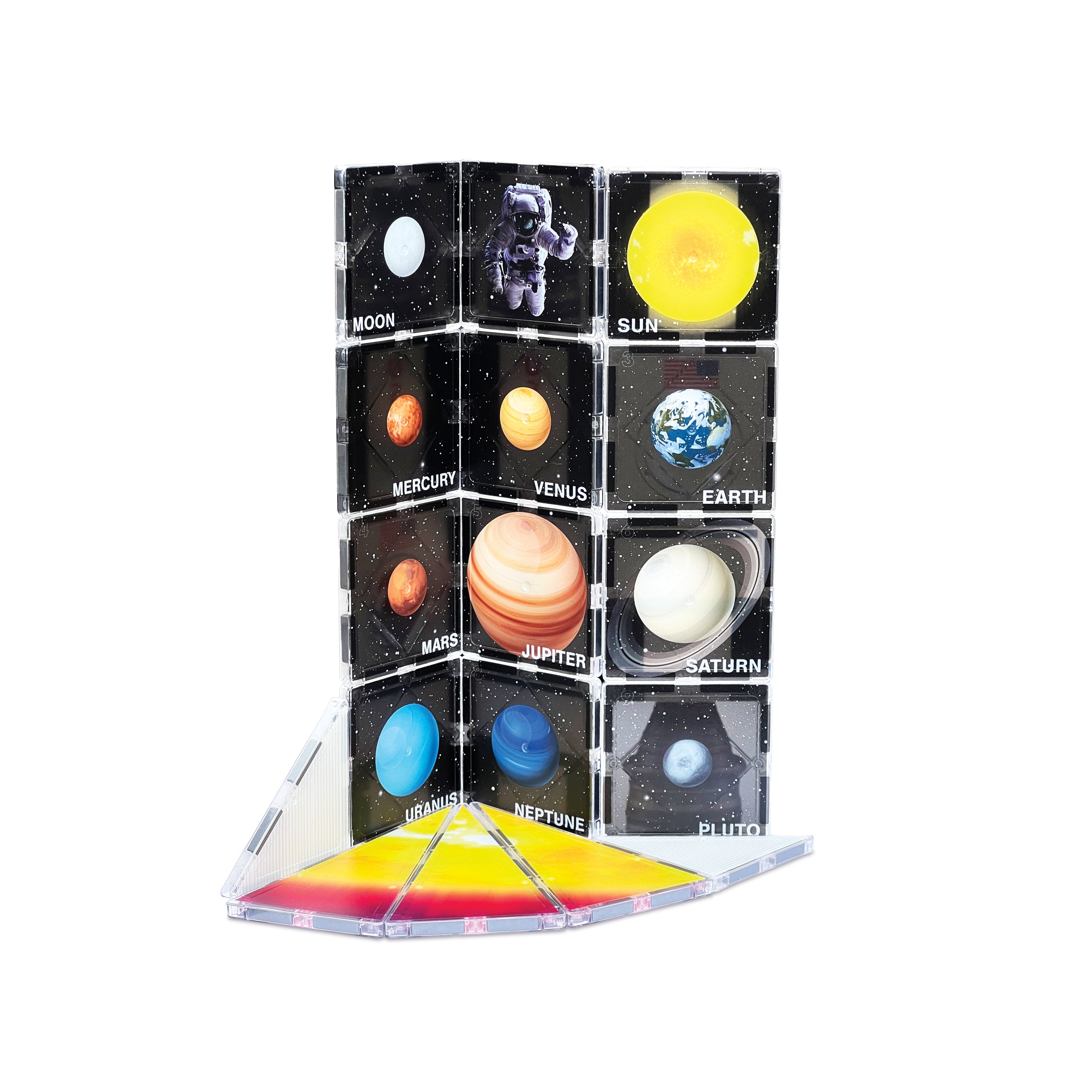 With 12 square tiles, 3 isosceles triangles, and 3 equilateral triangles, kids can assemble a towering rocketship exterior complete with NASA-inspired artwork. Flip the tiles over, and the fun goes educational—each reverse side features colorful planet graphics and fascinating space-themed details that spark curiosity and discovery, making this a fun space learning toy for hands-on play.